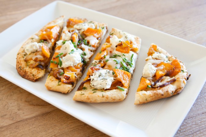 El puré de calabaza le da un toque suave y cremoso a la pizza, el cual se complementa muy bien con el dulzor y la textura de la cebolla caramelizada.