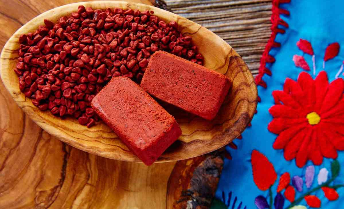 Lo primero es dejar madurar y secar el fruto en el árbol, que llega a medir hasta 4 metros de altura. Una vez que adquiere un tono café, se retiran las semillas y se maceran. Después se muelen en metate para obtener su color intenso y se forma una pasta; que es la que encontramos a la venta.