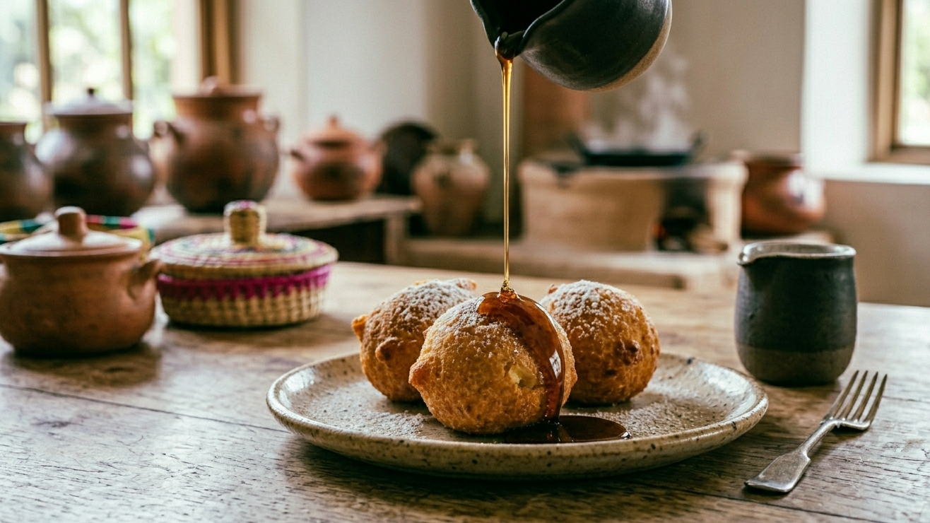 Esta preparación parte del clásico buñuelo aireado, frito y esponjoso, pero se distingue por el dulzor y el aroma de la miel de caña.