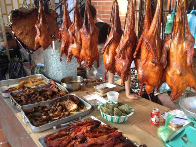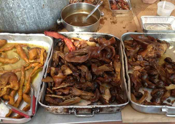 Si quieres, puedes comprar pedazos varios (ya cocinados), como cabezas de pato, orejas de cerdo, visceras e intestinos, y órganos que mejor es comerlos sin preguntar qué es. Yo lo hago.