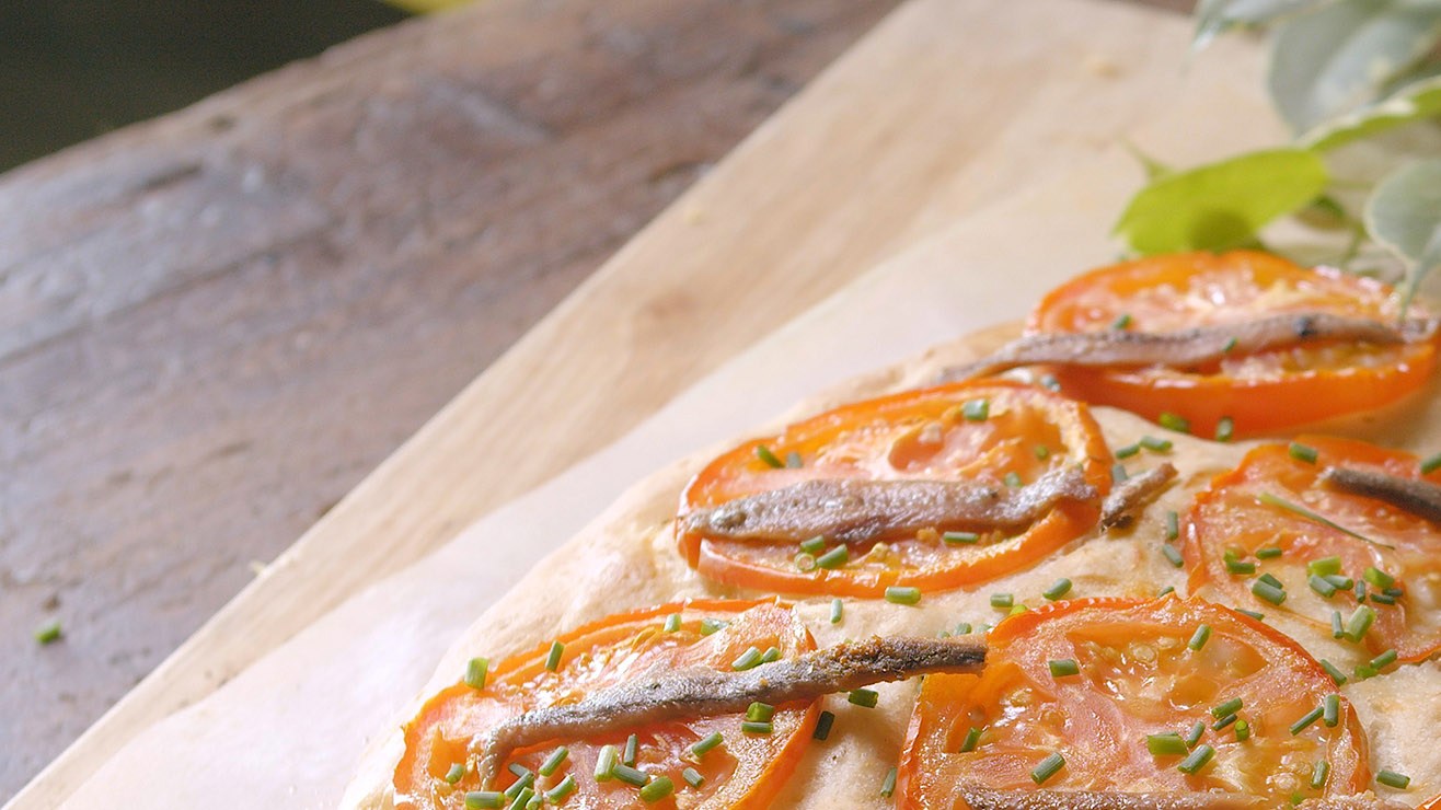 Incorporar el tomate triturado o en rodajas sobre la masa y distribuir las anchoas por toda la superficie. Rociar con un poco de aceite de oliva virgen extra.
