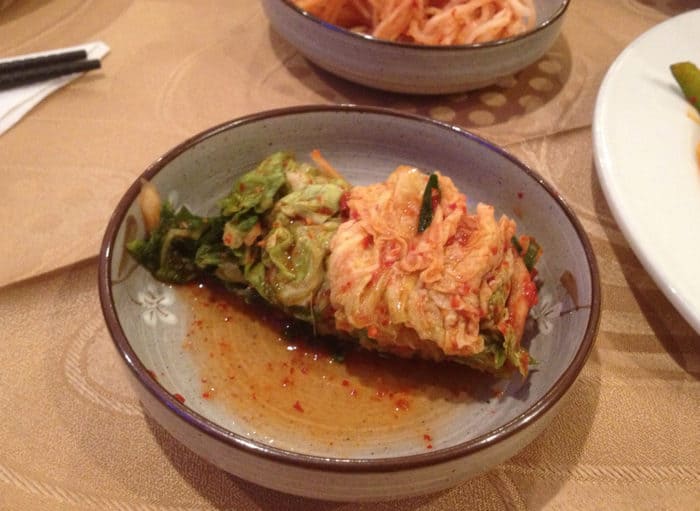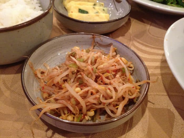 Sirven berros con picante, brotes de frijol con alguna salsa también semi-picante,nabo rallado (esto es delicioso), una tortilla de huevos con vegetales, a veces ponen boquerones secos con un sabor dulce-picante, y el protagonista infaltable de los contornos, el kimchi, que es un repollo fermentado picante, con un sabor rarísimo, explosivo, que te recuerda un poco al wasabi de los japoneses.