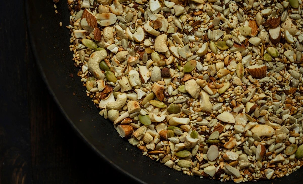 Añade los frutos secos y las semillas. Mezcla bien para que se integren y se tuesten de forma uniforme.