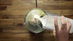 En una licuadora, incorpora las dos bolas de helado de vainilla y la leche líquida.
