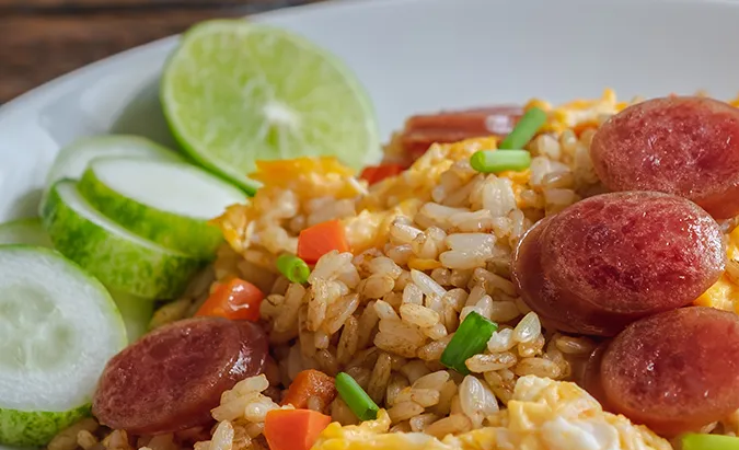 Almuerzo: Llegó el viernes y vamos a celebrarlo con un arroz frito con salchichas chinas. Es un plato que transformará todas las sobras que tienes en tu nevera, en una receta gourmet y cargada de sabor.