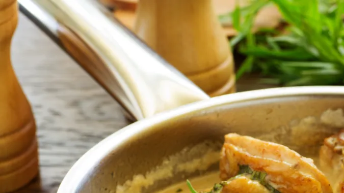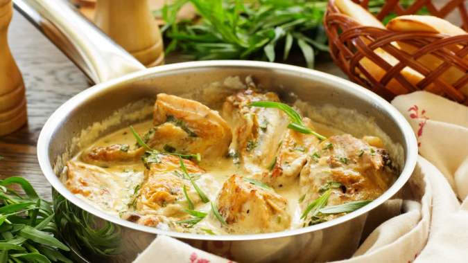 Almuerzo: Una receta completa, cremosa y que seguro pondrá a babear a tu oficina, es este pollo al estragón. Es una receta francesa que se prepara con muslos de pollo con hueso o deshuesado, como prefieras.