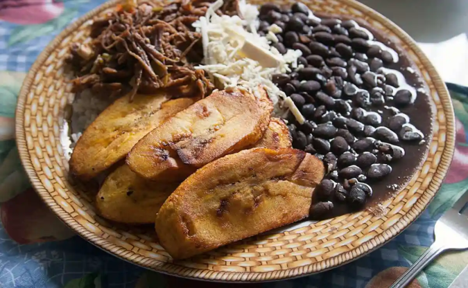 Este plato tiene arroz blanco, carne mechada, tajadas de plátano y caraotas negras. ¿Para qué más?