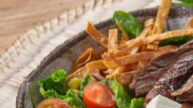 Para hacer esta ensalada con carne de res y aguacate debes comprar un buen filete de falda, ajo, limón, salsa de soya, lechuga, cebolla, aguacate, tomate, queso fresco y tortillas de maíz fritas.