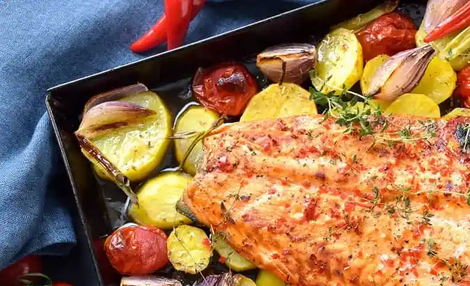 Almuerzo: El pescado al horno con papas es una receta clásica, reconfortante y muy sencilla de preparar. El secreto está en hornear lentamente el pescado junto con las papas, el ajo, el aceite de oliva y un toque de limón para que todos los sabores se integren. El resultado es un plato jugoso, aromático y equilibrado, ideal para quienes buscan una comida ligera pero sustanciosa.