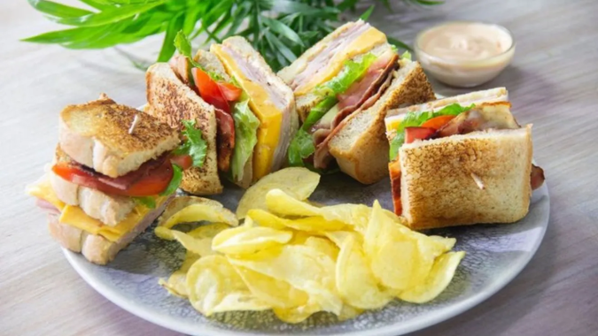 El club sándwich o clubhouse sándwich es un clásico de la comida rápida estadounidense, famoso por sus capas y su corte en triángulos. Se elabora con pan tostado, jamón de pavo y cocido, queso cheddar, tocineta, lechuga, tomate y mayonesa, acompañado de crujientes papas fritas. ¡Una combinación irresistible!