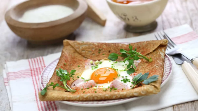 Se trata de una variante de crepe que, en lugar de elaborarse con harina de trigo, utiliza sarraceno, lo que le aporta un sabor más intenso y característico y se rellena con huevo, jamón cocido y queso emmental, súper cremoso.