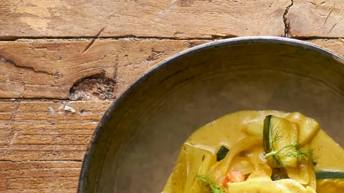 Cena: No hay una cena más deliciosa que este curry de verduras, fácil y cremoso. Este guiso especiado tiene sus raíces en la gastronomía asiática, especialmente en la India y Tailandia. Tiene una base de leche de coco y una combinación de verduras que lo hacen nutritivo y reconfortante.