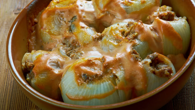 Cena: Sabemos que las cenas suelen ser la parte más difícil del día, pero con estas cebollas rellenas de pavo y queso crema vas a resolver la comida y quedarás muy feliz.