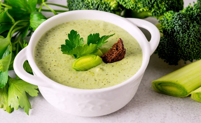 Cena: Una receta baja en calorías y con muchas propiedades es la sopa de brócoli y puerros, se sirve caliente y es bien cremosa para comerla sola o acompañada de pollo o pavo desmenuzado.