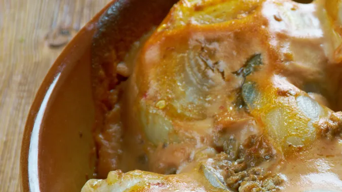 Cena: Sabemos que las cenas suelen ser la parte más difícil del día, pero con estas cebollas rellenas de pavo y queso crema vas a resolver la comida y quedarás muy feliz.