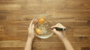 Calienta otra sartén y derrite la mantequilla. Agrega los huevos batidos, cocina durante dos minutos.