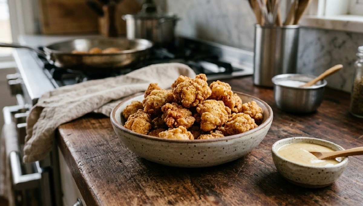 - Fríe las palomitas de pollo en tandas para mantener la temperatura del aceite.