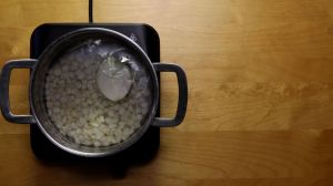 Calienta olla con 8 tazas de agua y agrega el maíz precocido y la cebolla.