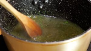 Pasados los 40 minutos, retira las hojas de laurel y añade los trozos de pierna, la salsa verde, y sal al gusto.