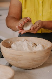 Formar las pupusas: Humedece tus manos con agua y un poco de aceite. Toma un trozo de masa del tamaño de una pelota de golf (aprox. del tamaño de un huevo).