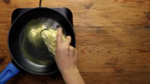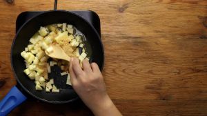 Calienta una cazuela y derrite la mantequilla. Una vez esté líquida, incorpora la manzana troceada.