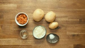 Prepara los ingredientes para la receta. Pela las papas y la cebolla y córtalas en cubos pequeños.