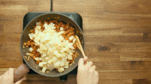 Incorpora el chorizo y mezcla muy bien con la cebolla. Cocina por 10 minutos hasta que se sofría.