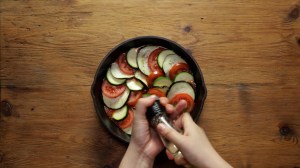 Acomoda una rodaja de berenjena, luego una rebanada de tomate y otra de calabacita. Hazlo así de manera alterna hasta llenar el molde comenzando de adentro hacia afuera. Cuando termines, sazona con sal y pimienta al gusto.