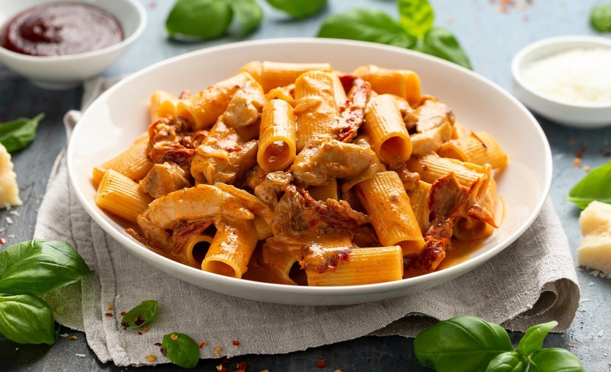 Prepara un cremoso rigatoni con pollo y salsa de zanahoria