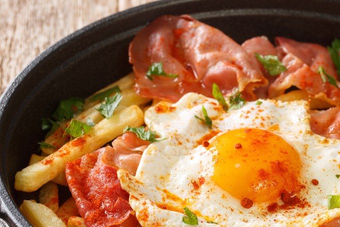 Básicamente son huevos fritos en sartén, con abundante aceite de oliva, a los que se les deja la yema casi cruda de manera que se rompan fácilmente al momento de servir. La receta original se sirve con patatas fritas, que son el acompañante principal para este plato, pero si es para el desayuno y te parece demasiado, puedes servirlos en una cama de pan, salchichas, jamón y tus ingredientes favoritos.