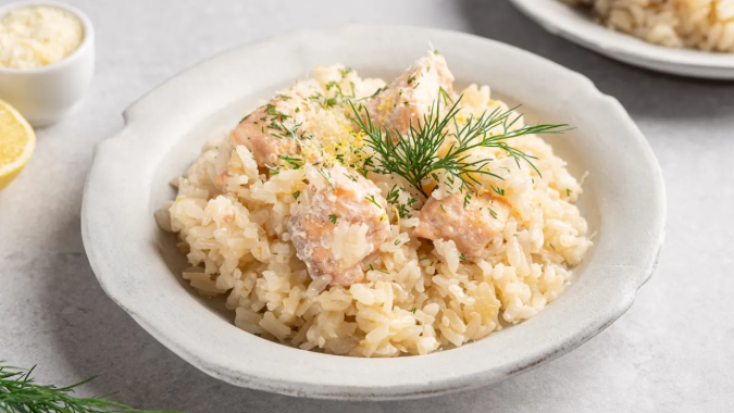 Almuerzo: Iniciemos la semana con un risotto de bacalao, una receta clásica italiana que se puede preparar en solo 40 minutos y es muy delicioso.