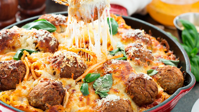 Almuerzo: Un almuerzo que nunca falla son las pastas, así que puedes preparar un delicioso gratinado de espaguetis con albóndigas.