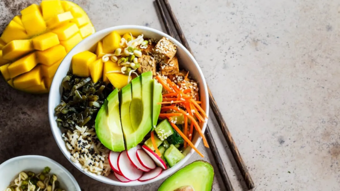 Cena: Si quieres comer más vegetales, pero de una forma diferente, prepara este poke bowl vegano. Aunque suele prepararse con pollo o cerdo, esta vez utilizaremos tofu, mango, zanahoria, rábano y aguacate, aunque también puedes añadir otros ingredientes.