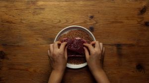 - Frota el rub con firmeza hasta que se forme una capa uniforme de especias. Eso asegurará buen sabor al cocinar.