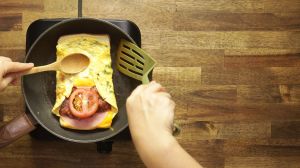 Cuando el huevo esté cuajado, voltea. Incorpora el mozzarella, el cheddar, las lonchas de jamón, el tocino y el tomate.