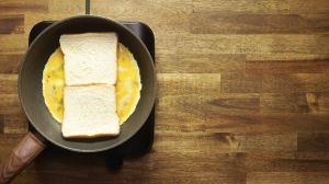 Una vez el pan esté tostado, dobla el excedente de huevo y dobla también el pan.