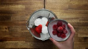Para el smoothie de frutos rojos, incorpora en la licuadora el hielo y las fresas congeladas.