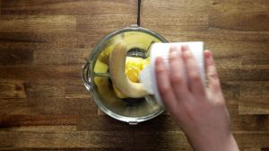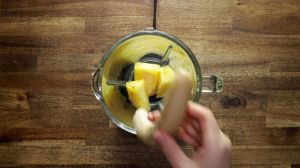 Para hacer el primer smoothie, agrega en una licuadora la piña y el plátano congelado.
