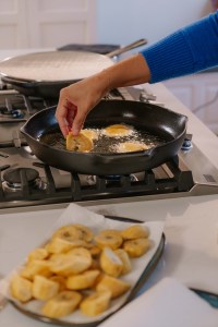 Agrega con cuidado los plátanos al aceite caliente y fríelos por aproximadamente 2 minutos de cada lado en la sartén de hierro fundido VARDAGEN para suavizarlos. Luego colócalos sobre un plato con una toalla de cocina o papel absorbente.