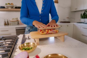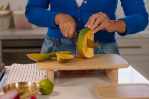 Prepara el pico de gallo de mango cortando todos los ingredientes sobre la cómoda tabla de bambú con patas STOLTHET.